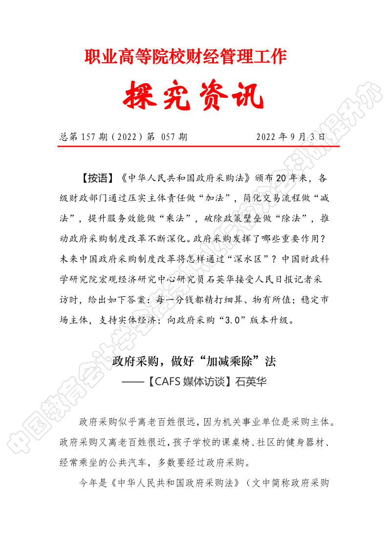 探究资讯157:【CAFS媒体访谈】石英华 政府采购,做好“加减乘除”法