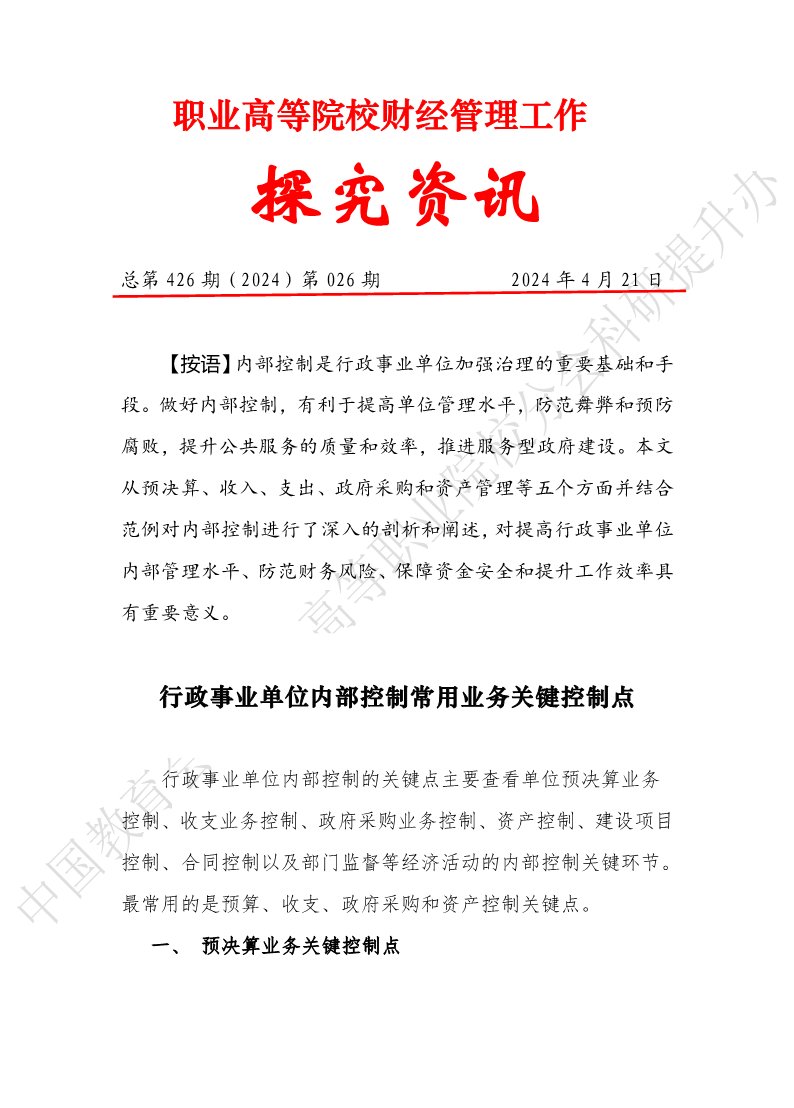 探究资讯426:行政事业单位内部控制常用业务关键控制点