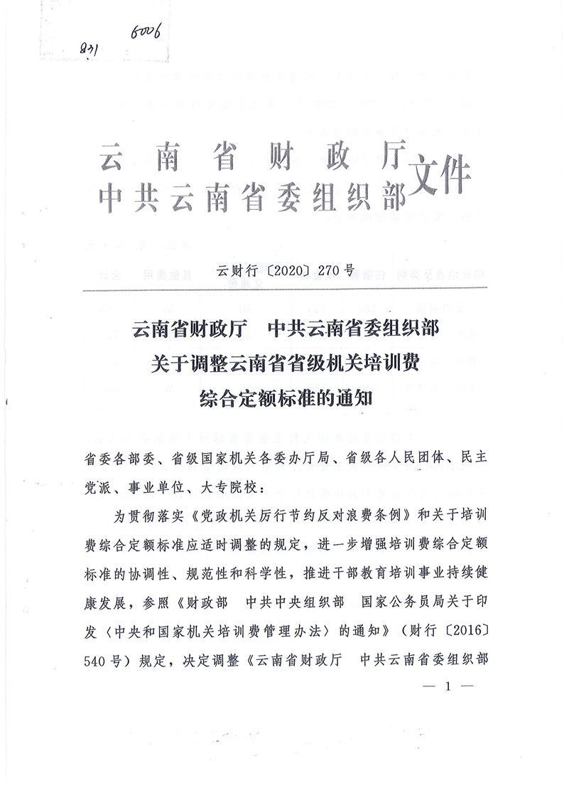 关于调整云南省省级机关培训费综合定额标准的通知