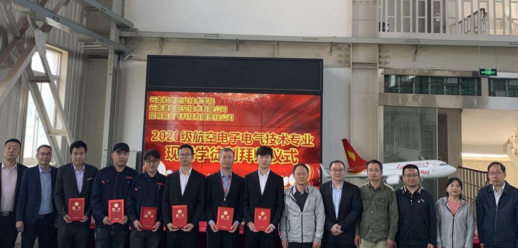 为弘扬师徒文化,践行学徒精神,电气工程学院2020级航空电子电气技术专业于2021年4月30日上午隆重举行了现代学徒制拜师仪式。学院副院长黄勇林、校企合作办公室副主任杨晓春、电气工程学院院长杨志红、副书记刘志华、副院长刘军、云南港翊航空总经理张雪明、副总经理刘登攀、昆明易安飞科技有限公司总经理张庆中、副总经理杨磊等领导和师傅,以及航空电子电气技术专业38名学生参加了拜师仪式。