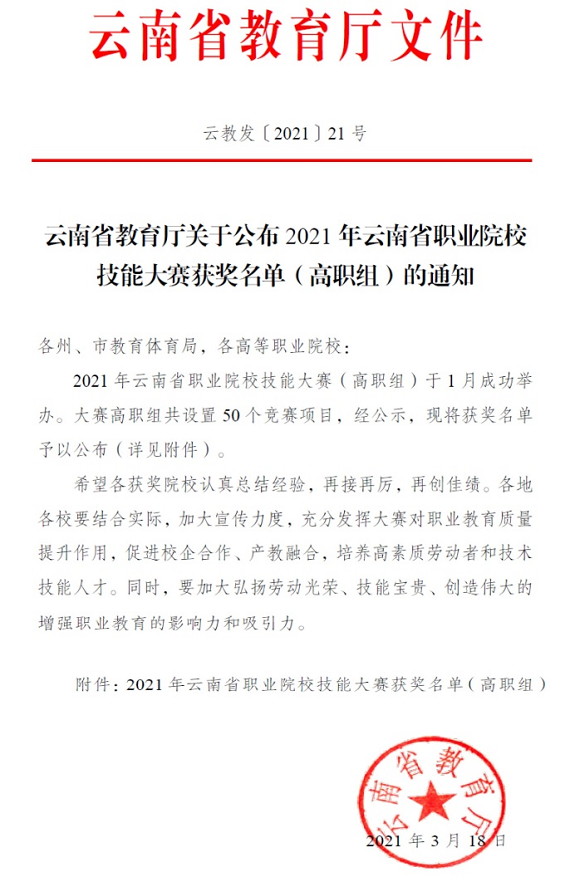 为贯彻落实全国教育大会精神和《国家职业教育改革实施方案》,深化推进职业教育改革,搭建技能展示、交流平台,同时选拔优秀选手参加全国职业院校技能大赛,2021年1月,由云南省教育厅主办,云南省高等职业院校实践教学指导委员会协办,各州市或职业院校承办的云南省职业院校技能大赛在昆明拉开帷幕。