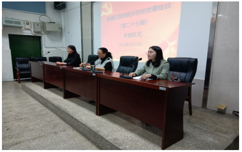 2021年4月13日,机械工程学院举办分党校第二十七期党课培训开班仪式。参加开班仪式的有学院党总支书记李红、副书记周利平、专职组织员龙美芳及70余名入党积极分子,开班仪式分为三项议程。