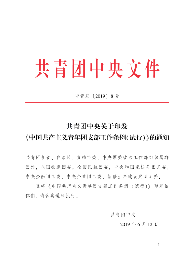 共青团中央关于印发《中国共产主义青年团支部工作条例(试行)》的通知(中青发〔2019〕8号) 来源: 发布时间:2024-09-30 20:02:07 浏览次数: 次 【字体:小 大】 终审:赵艳妮 分享到: 打印文章