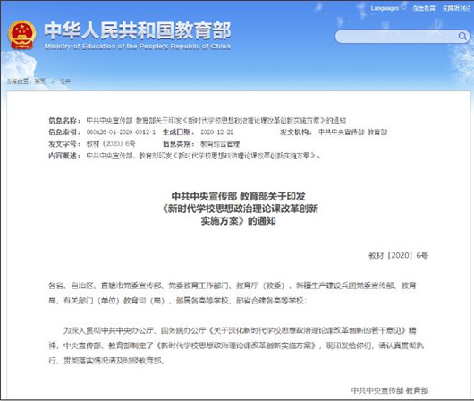 来源:教育部网站、高校思政网 发布时间:2021-01-05 10:24:03 浏览次数: 【字体: