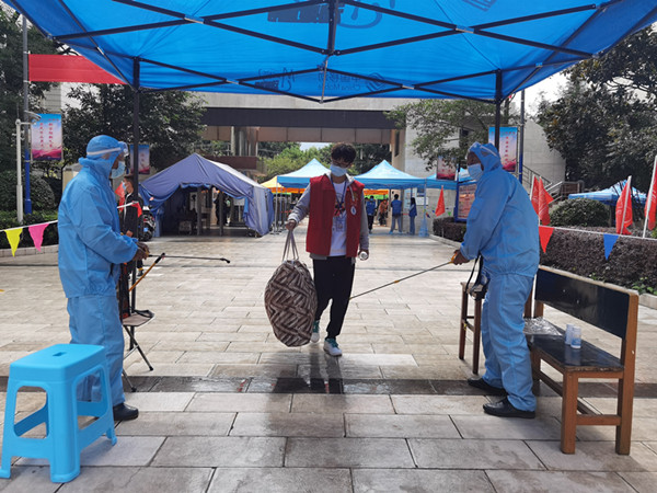 在入校通道口,防疫工作人员身着隔离服,一丝不苟地查看每位同学的健康码和行程码、核酸检测阴性报告,进行身份核验,测温、行李消杀,细心保障着大家的生命安全与身体健康。根据疫情防控要求,送新生的校外车辆和家长亲属不能入校,学校在正门外设有家长亲属等候区。