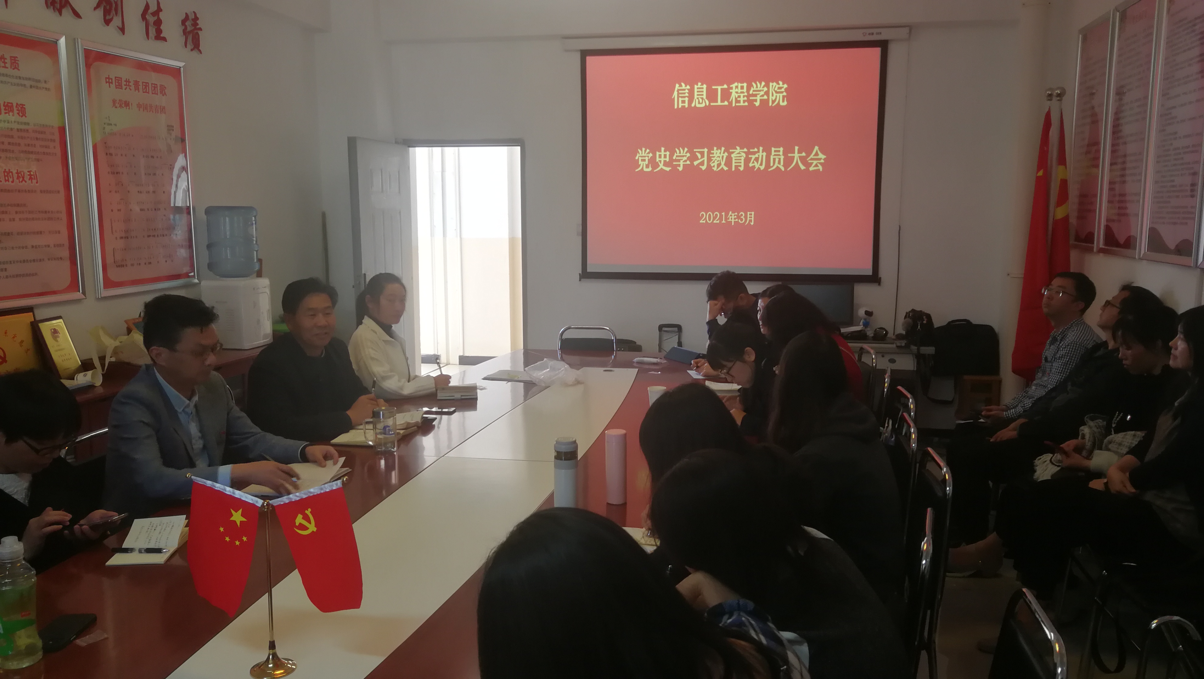 2021年3月16日,信息工程学院在党员活动室D503召开党史学习教育动员大会。会上认真学习习近平总书记在党史学习教育动员大会上的重要讲话精神和党中央《关于在全党开展党史学习教育的通知》精神,对学院党史学习教育进行全面动员部署。会议由党总支书记王有全同志主持,我院全体教师参加。