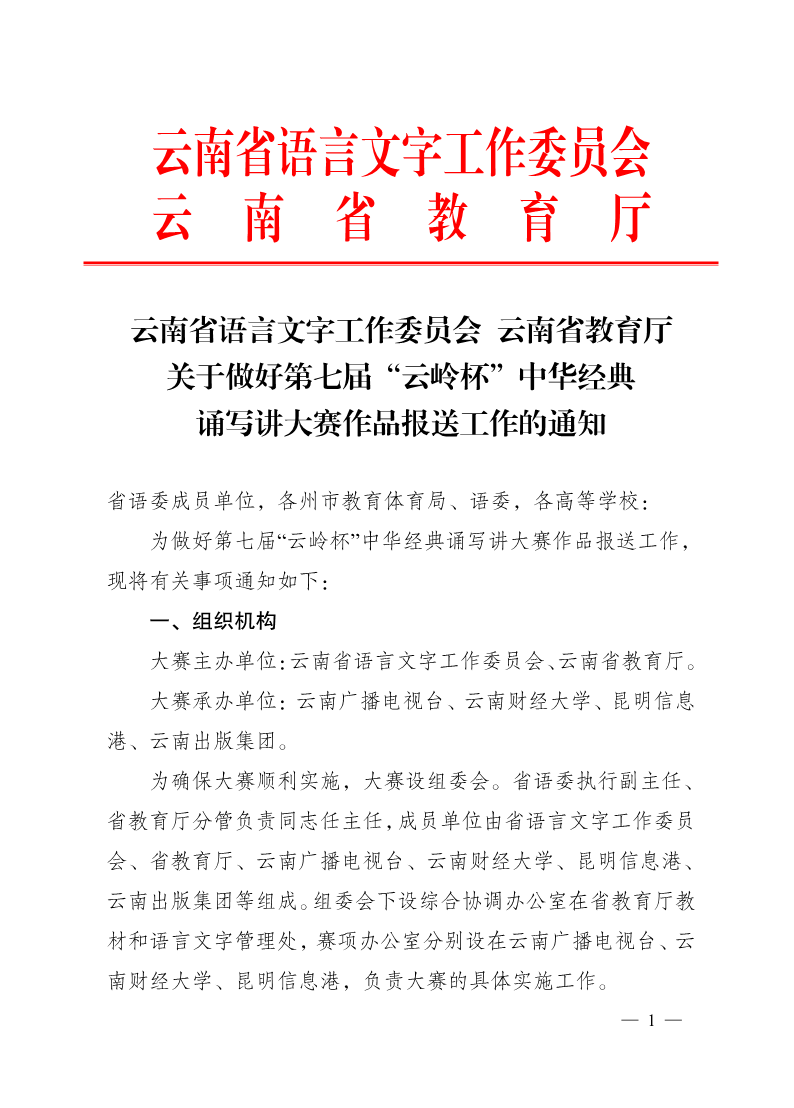 云南省语言文字工作委员会云南省教育厅关于做好第七届“云岭杯”中华经典诵写讲大赛作品报送工作的通知 来源: 发布时间:2025-07-10 09:22:38 浏览次数: 次 【字体:小 大】 正文附件 终审:李坤明 分享到: 【打印正文】